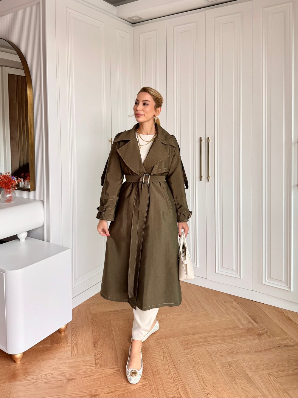 Trençkot Kolda ve Bilekte Kemer Detaylıdır.