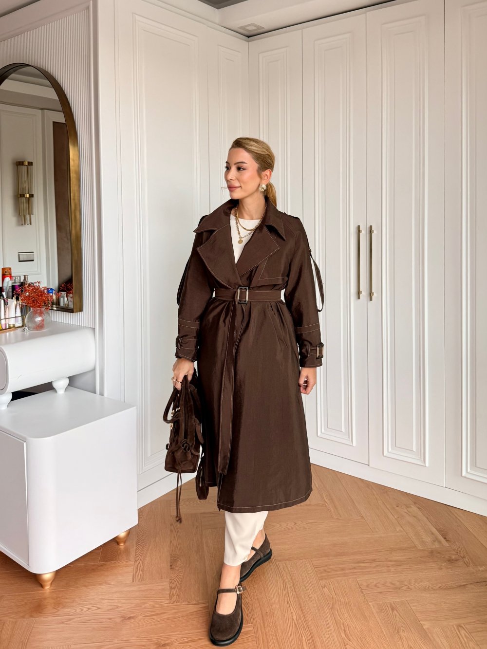 Trençkot Kolda ve Bilekte Kemer Detaylıdır.