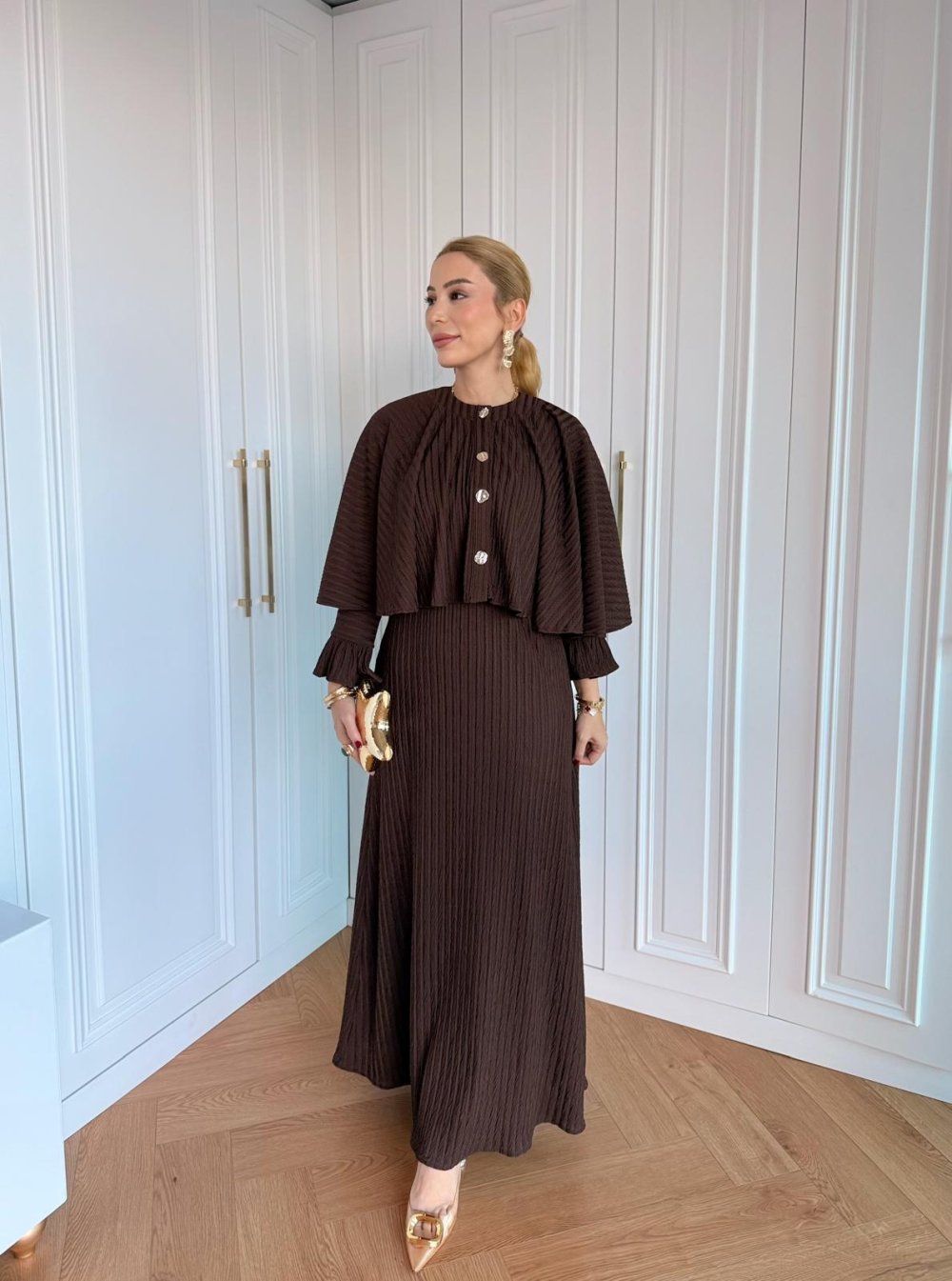 Elbise Çıkarılabilir Düğme Detaylı Pelerinlidir.