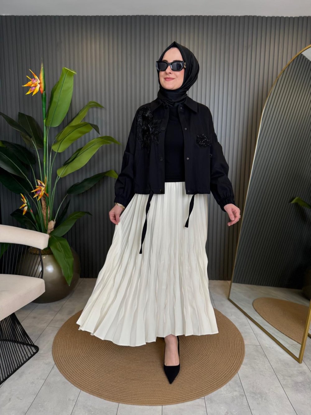 —Krep Kumaş. Etek beli lastiklidir. Astarsızdır.