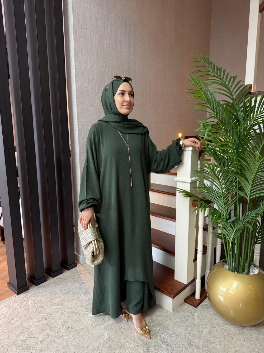 Asimetrik Detay Şallı Üçlü Takım Haki