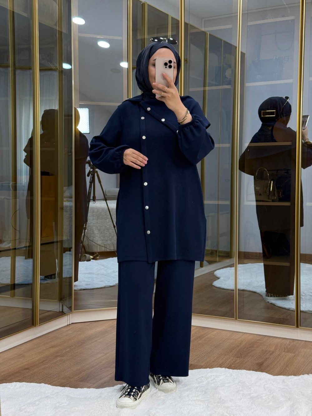 Asimetrik Metal Düğme Detaylı Takım Lacivert