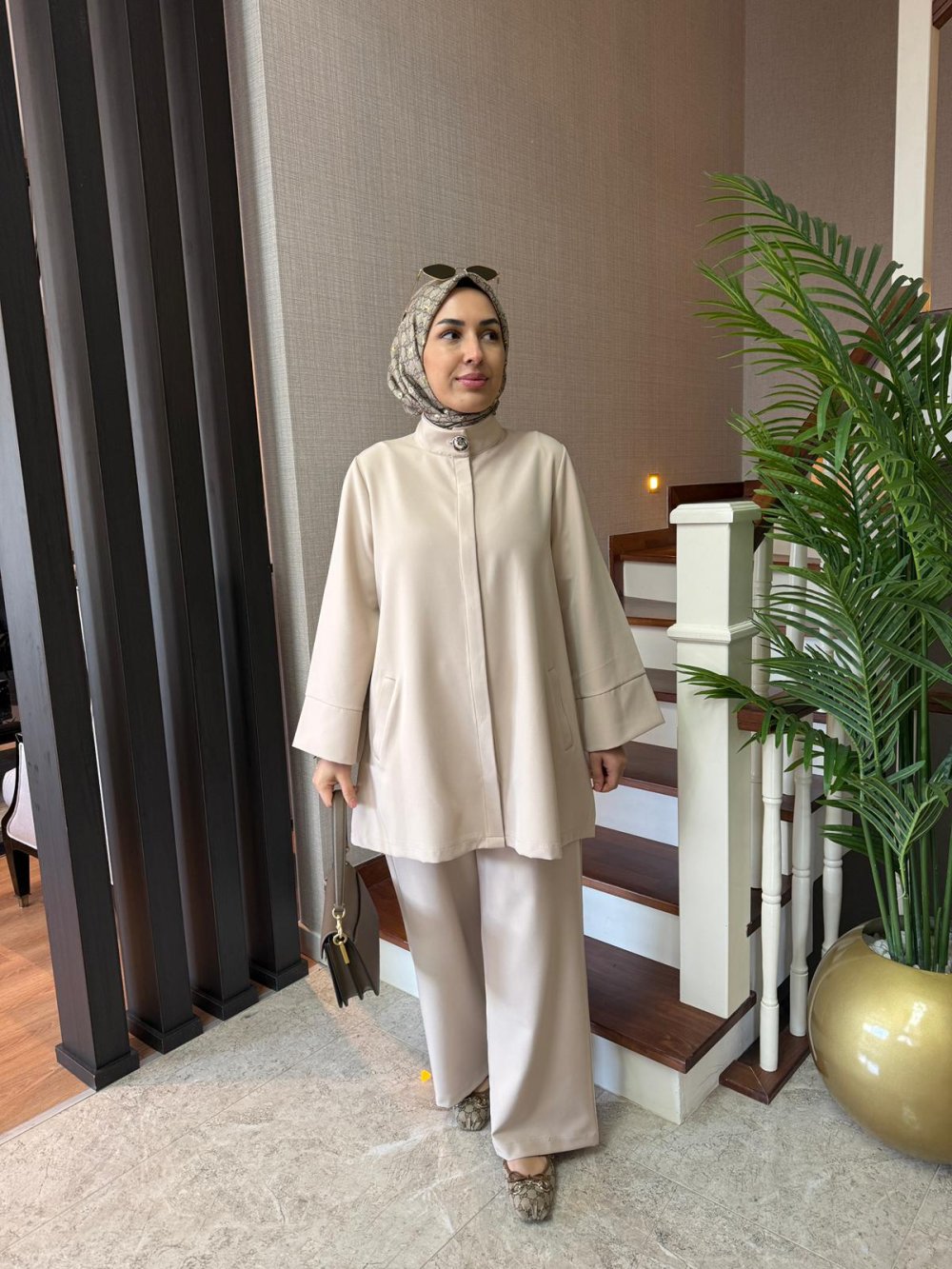 Tunik önden gizli düğmelidir, boynunda gold düğme detayı ve yanlarda cepleri bulunmaktadır.