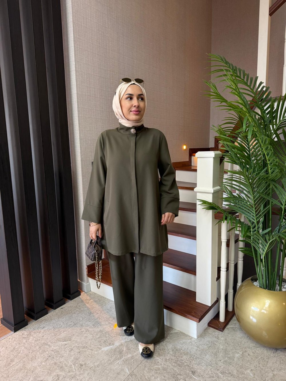 Tunik önden gizli düğmelidir, boynunda gold düğme detayı ve yanlarda cepleri bulunmaktadır.