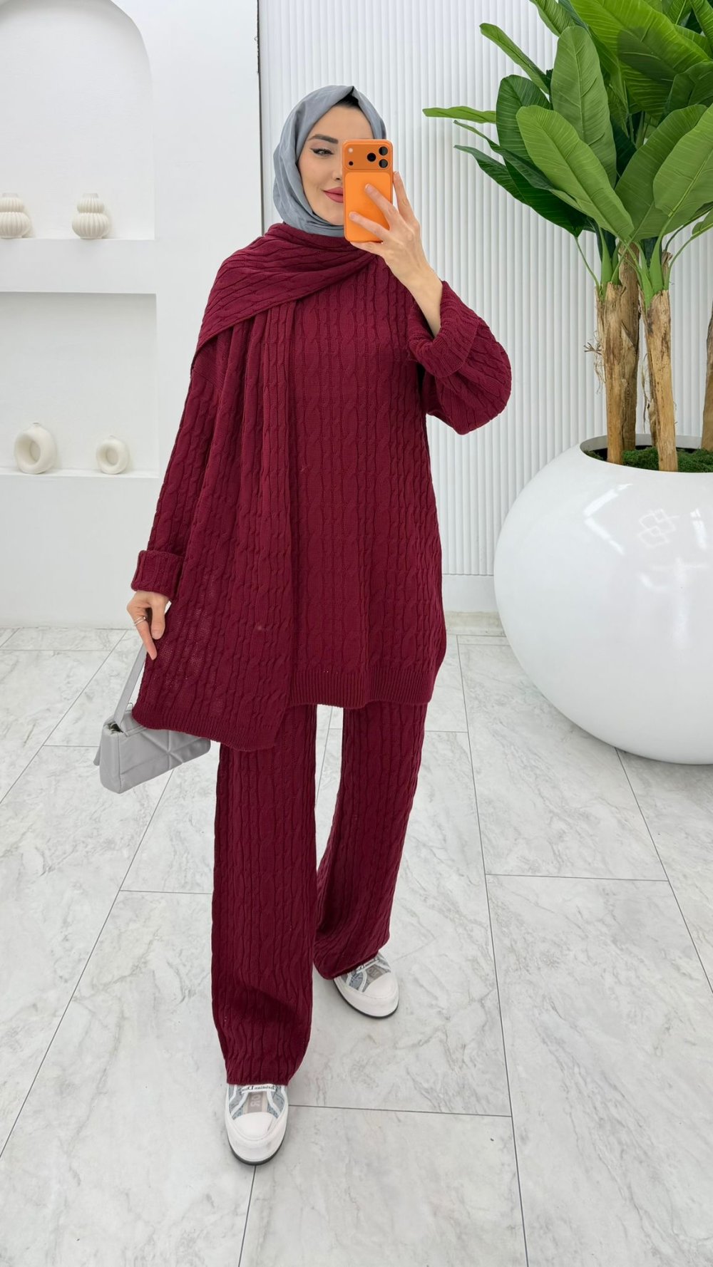 Bordo Premıum Atkılı Triko Takım Tesettür Giyim