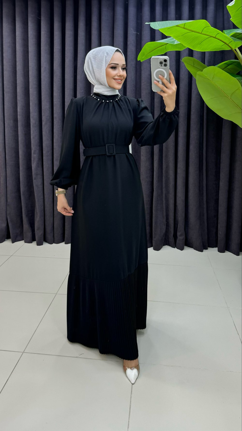ELBİSE ETEK UCU PLİSE DETAYLIDIR.