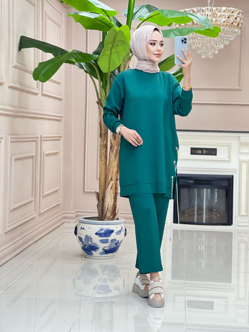 Tunik yanları taşlı bağlama detaylıdır