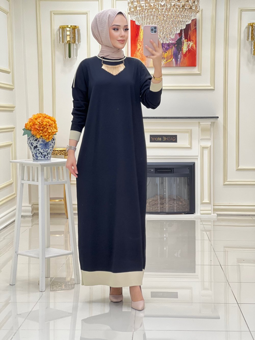 ELBİSENİN YAKASI  RİBANA DETAYLIDIR