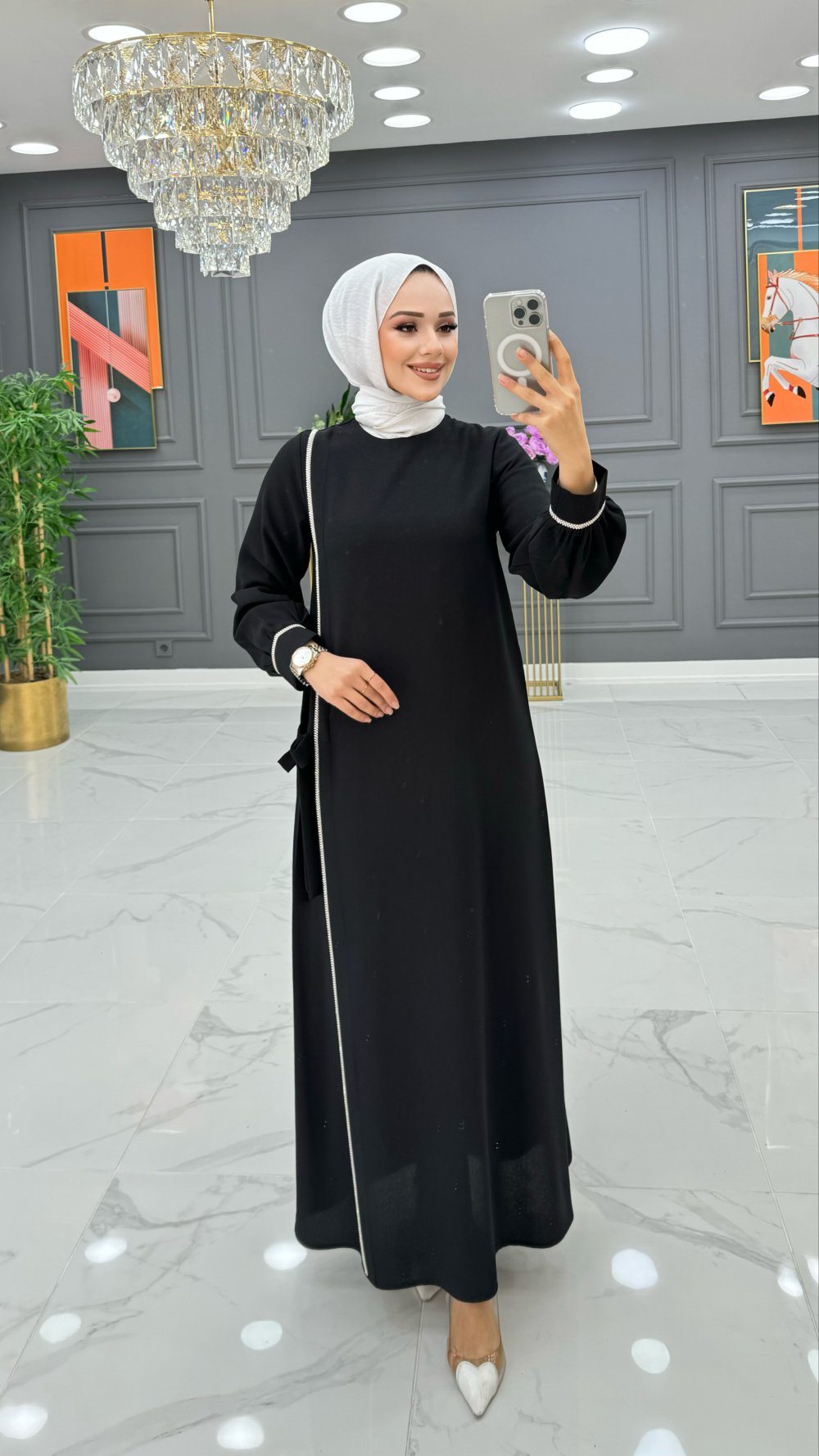 ELBİSE ÖN VE MANŞET TAŞ DETAYLIDIR.