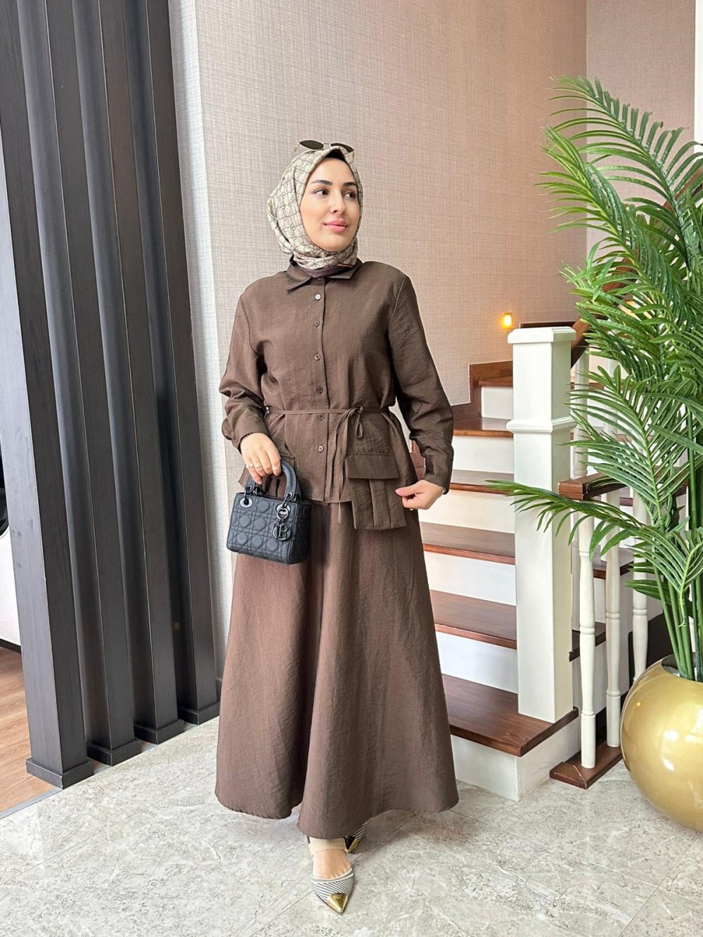 Cep Detaylı Cupra Etekli Takım Kahverengi