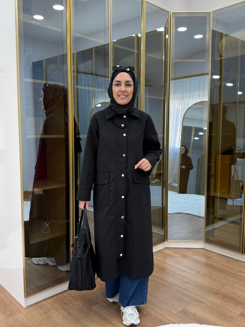Çıtçıtlı Detaylı Parka Trençkot Siyah