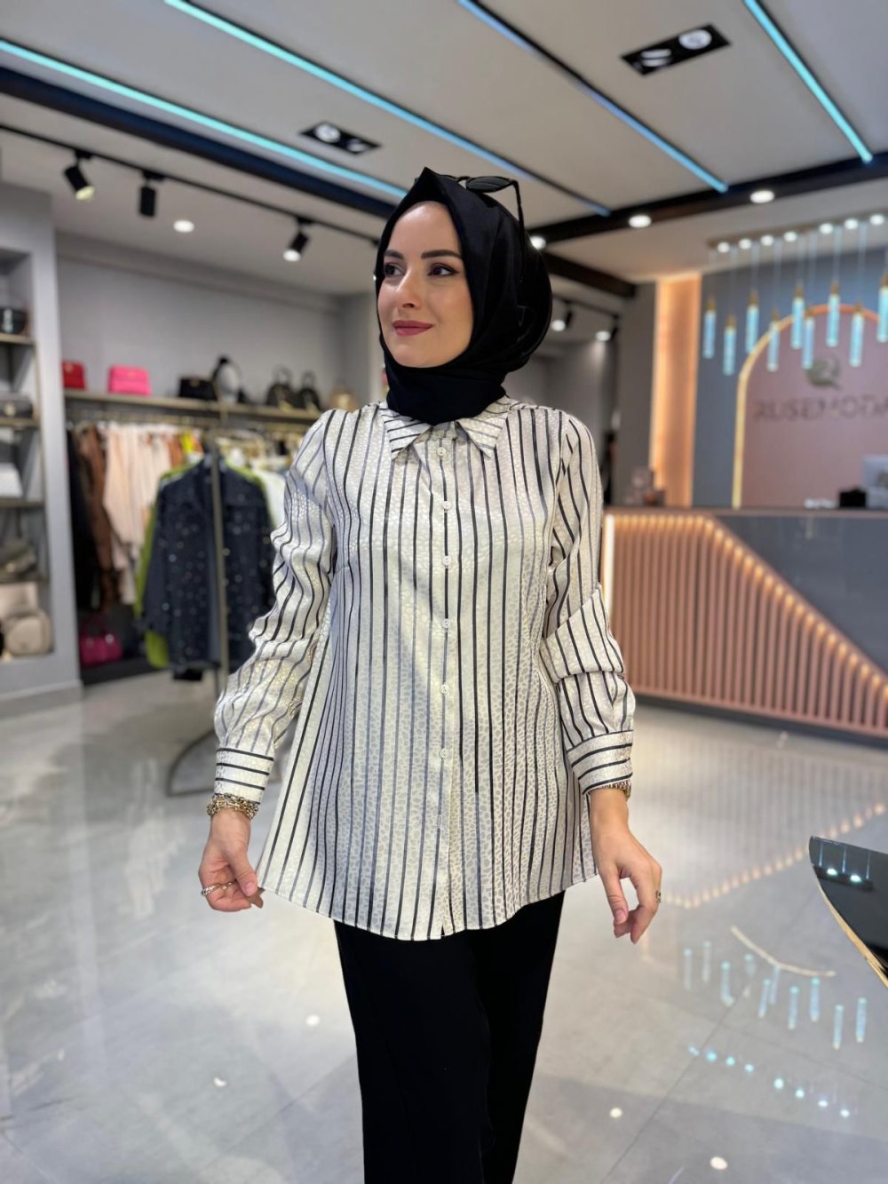 Bu şık gömleğimiz, uçuş uçuş kumaşıyla üzerinizde yokmuş gibi hissiyat verirken aynı zamanda sizlere şık bir görünüm sağlıyor. Tek renk seçeneği ve şık tasarımıyla çizgili görünümü ister günlük hayatınıza isterseniz de şık bir ofis konseptine uyarlanarak tasarlanmıştır. kumaş kalitesi sizler yormaz, üzerinizde ağırlık yapmaz. Dilerseniz etek ile dilerseniz kalem pantolon ile sizlerin dolabınızın vazgeçilmezi olacaktır.
