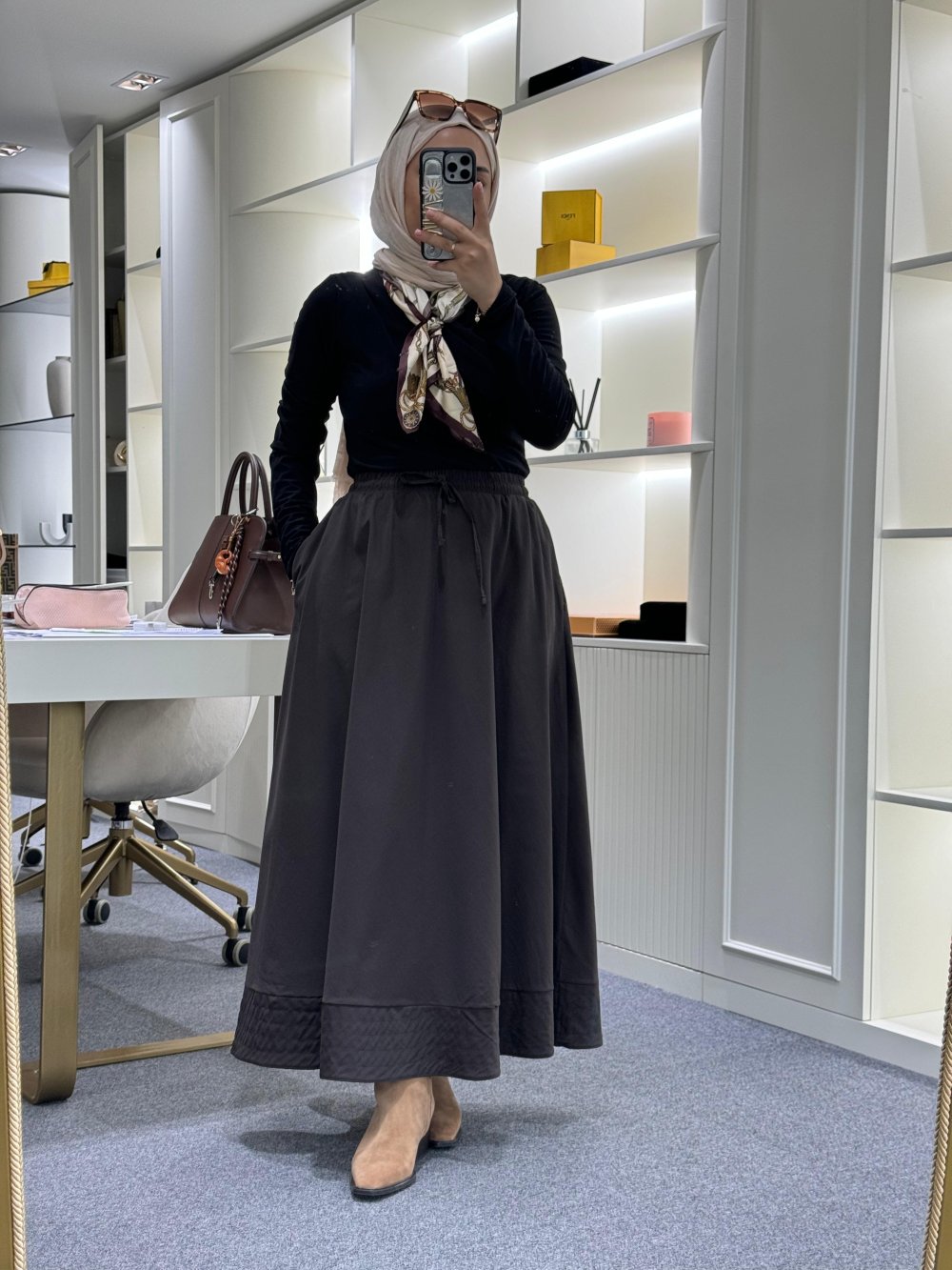 Dikiş Detaylı Beli Lastikli Etek Kahverengi