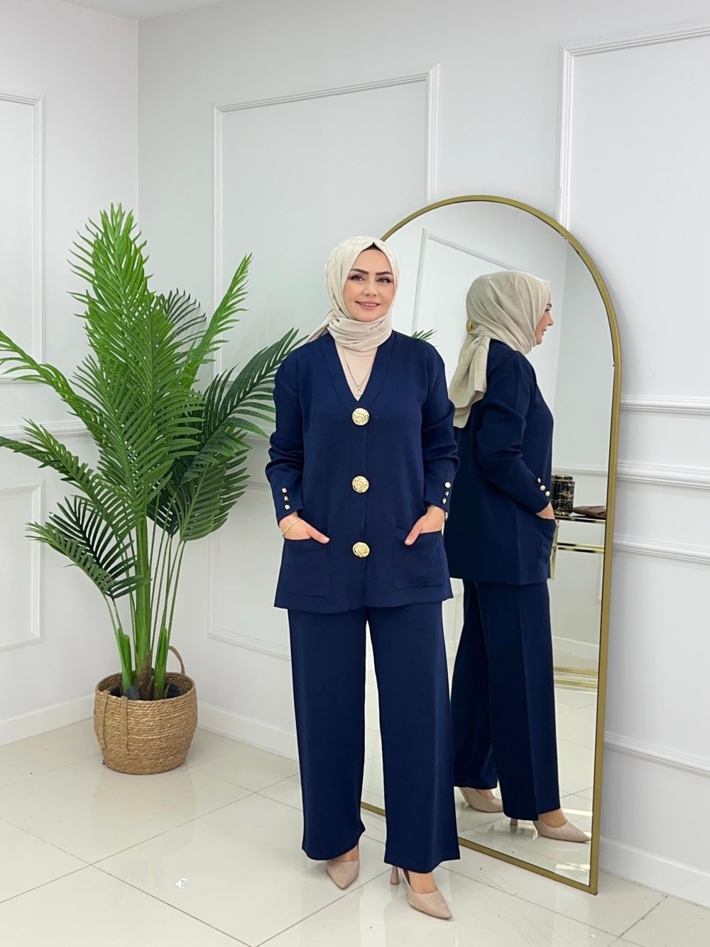 Merserize kumaşın asil duruşu, gold detayların zarafetiyle buluştu.