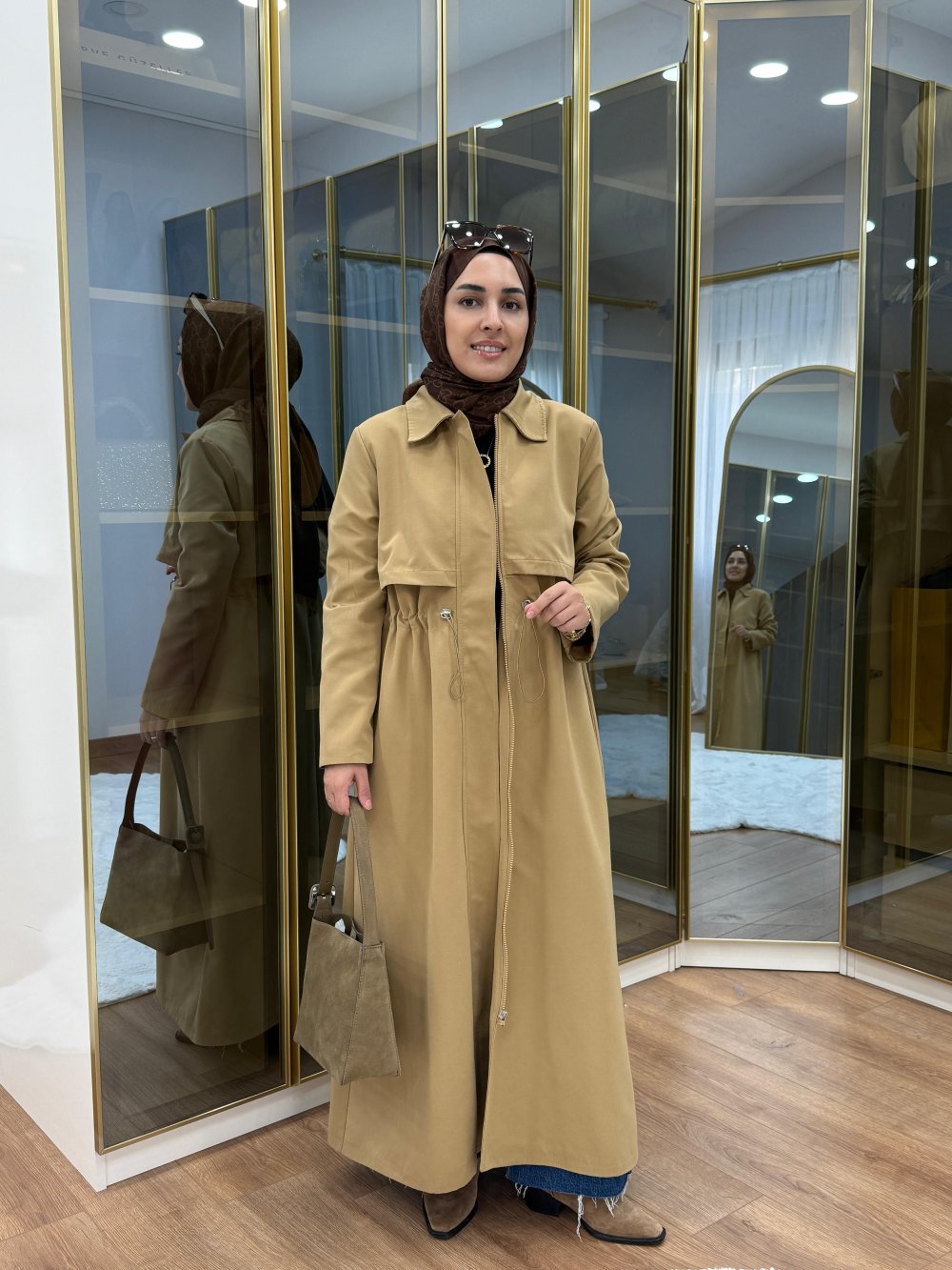 Fermuar Detaylı Maksi Boy Trençkot Camel