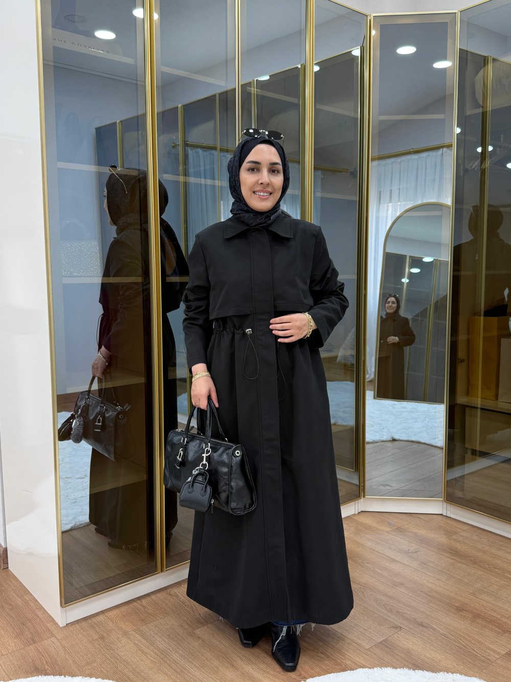 Fermuar Detaylı Maksi Boy Trençkot Siyah