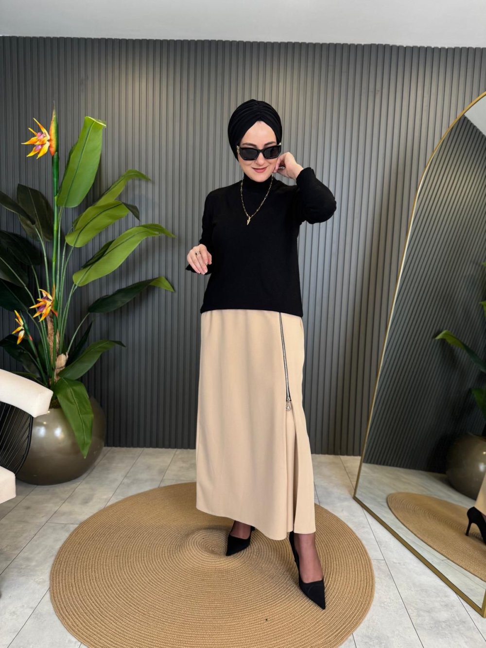 — Krep Kumaş. Etek beli lastiklidir. Astarsızdır. İç göstermez