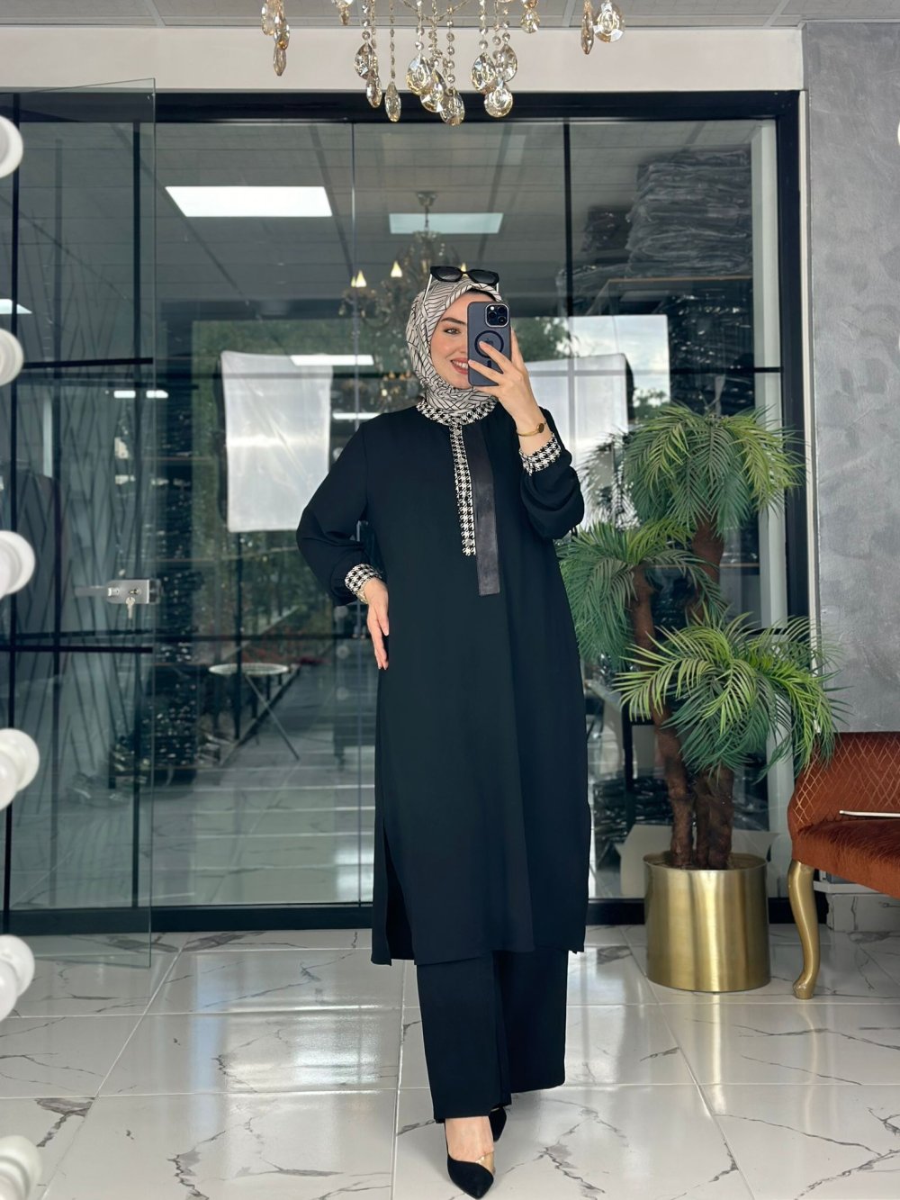 Kumaşı kreptir. Önü ve kolları düğmelidir. Pantolon beli lastiklidir.