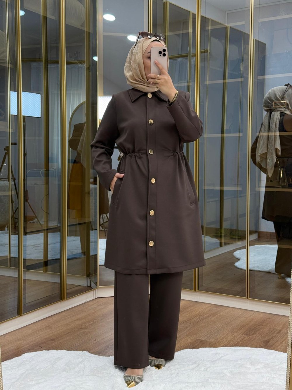 Gold Düğmeli Beli büzgülü Scuba Takım Kahverengi