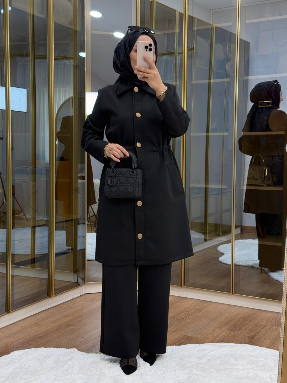 Gold Düğmeli Beli büzgülü Scuba Takım Siyah