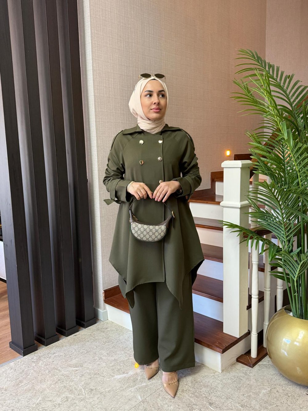 Gold Düğmeli Double Krep Takım Haki