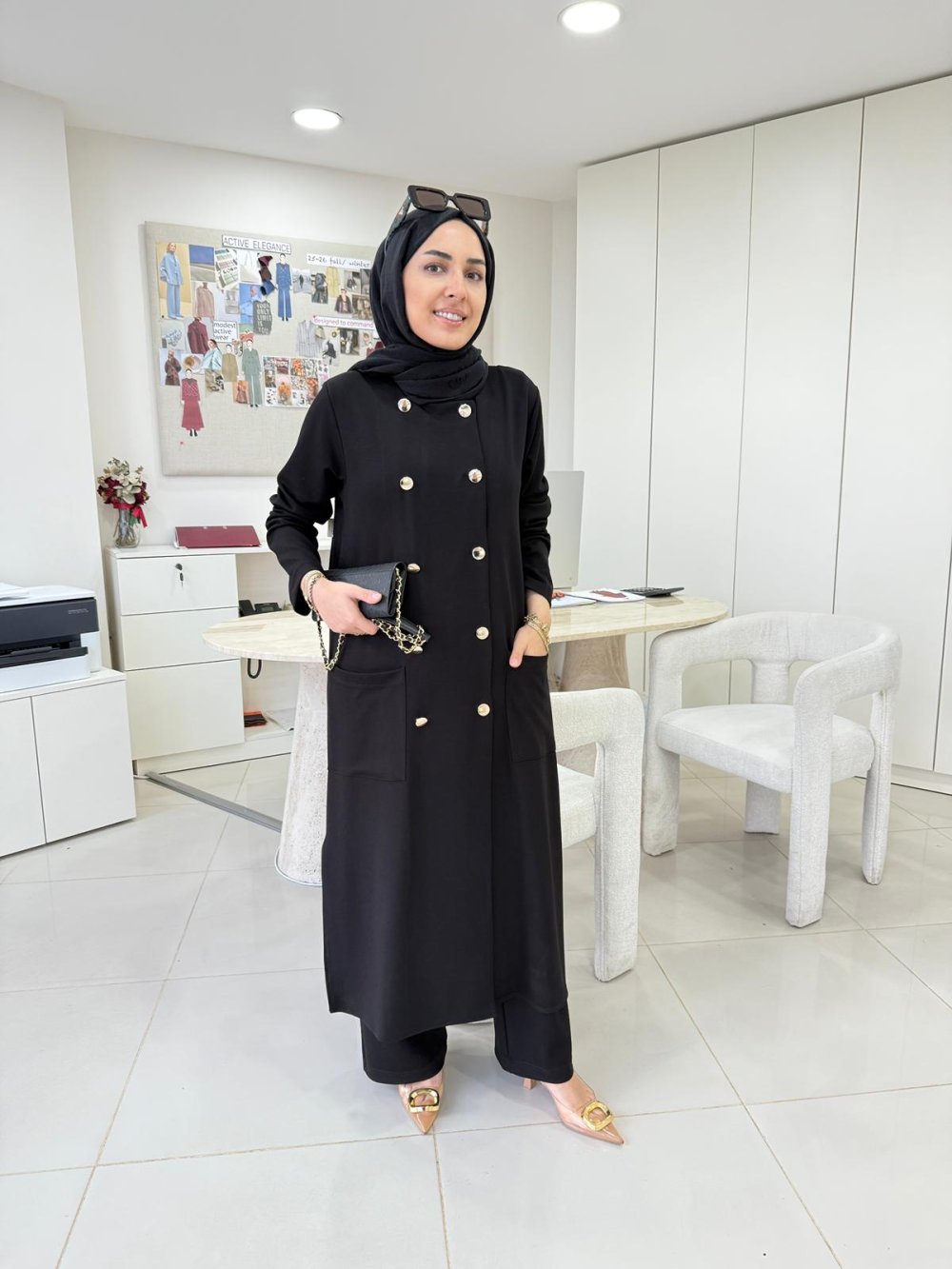 Kap boy 120 cm’dir. Önünde gold düğme detayları ve cepleri bulunmaktadır.