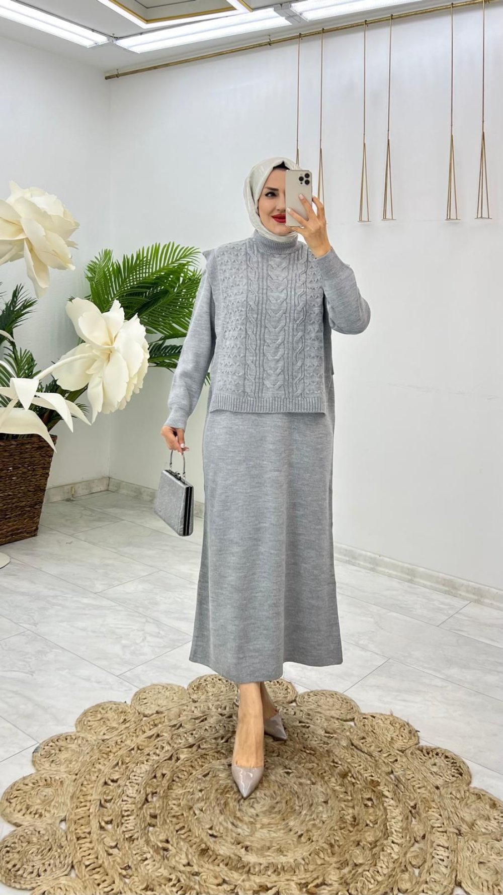 Gri Kahve Damla Triko Elbise Takım Tesettür Giyim