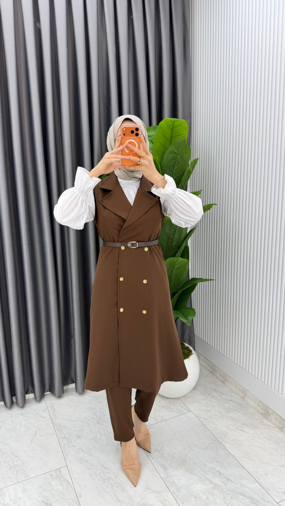 Kahve Tuğba Kemerli Yelek Takım Tesettür Giyim