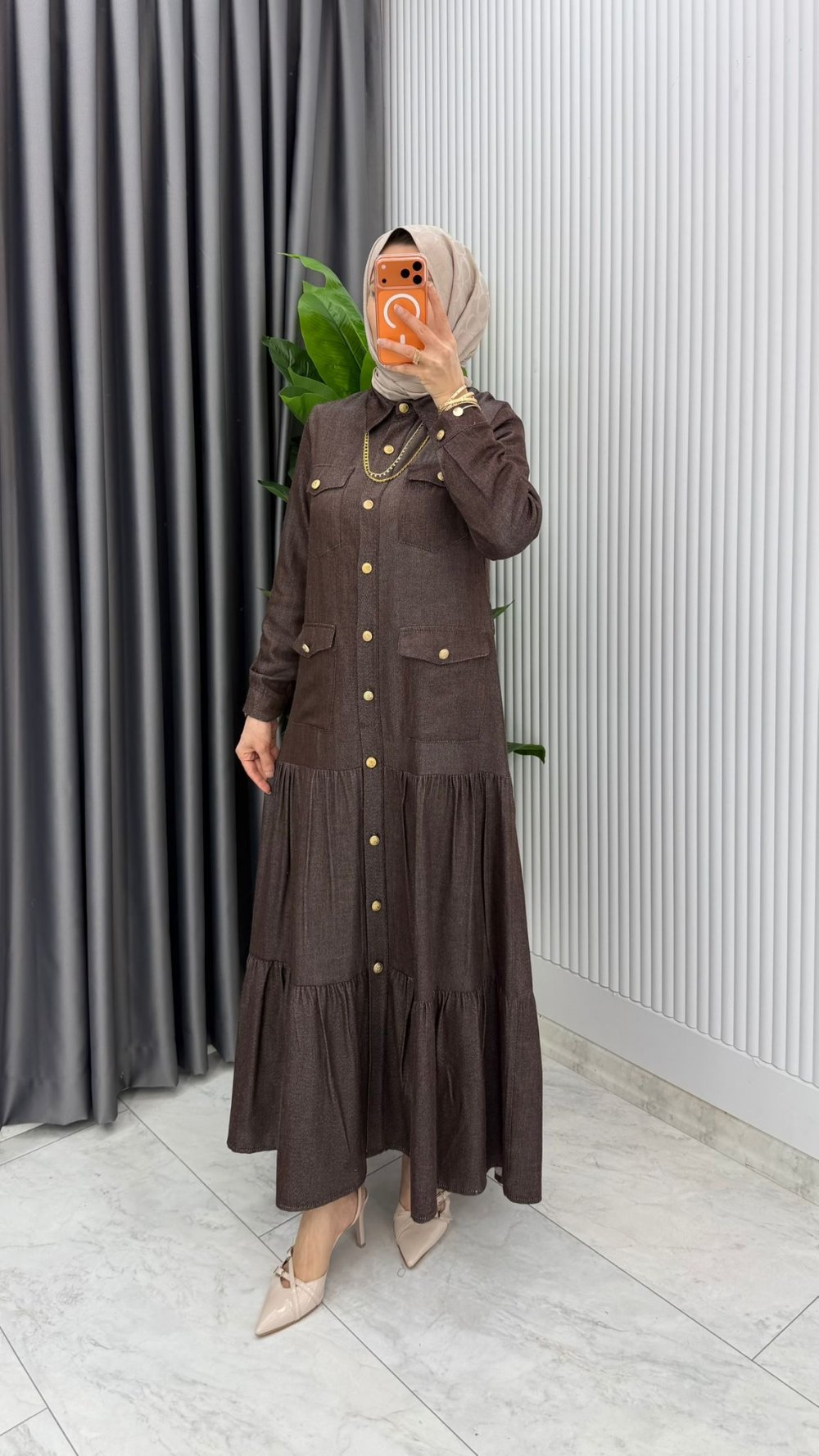 Kahverengi Kemerli Eslem Kot Elbise Tesettür Giyim