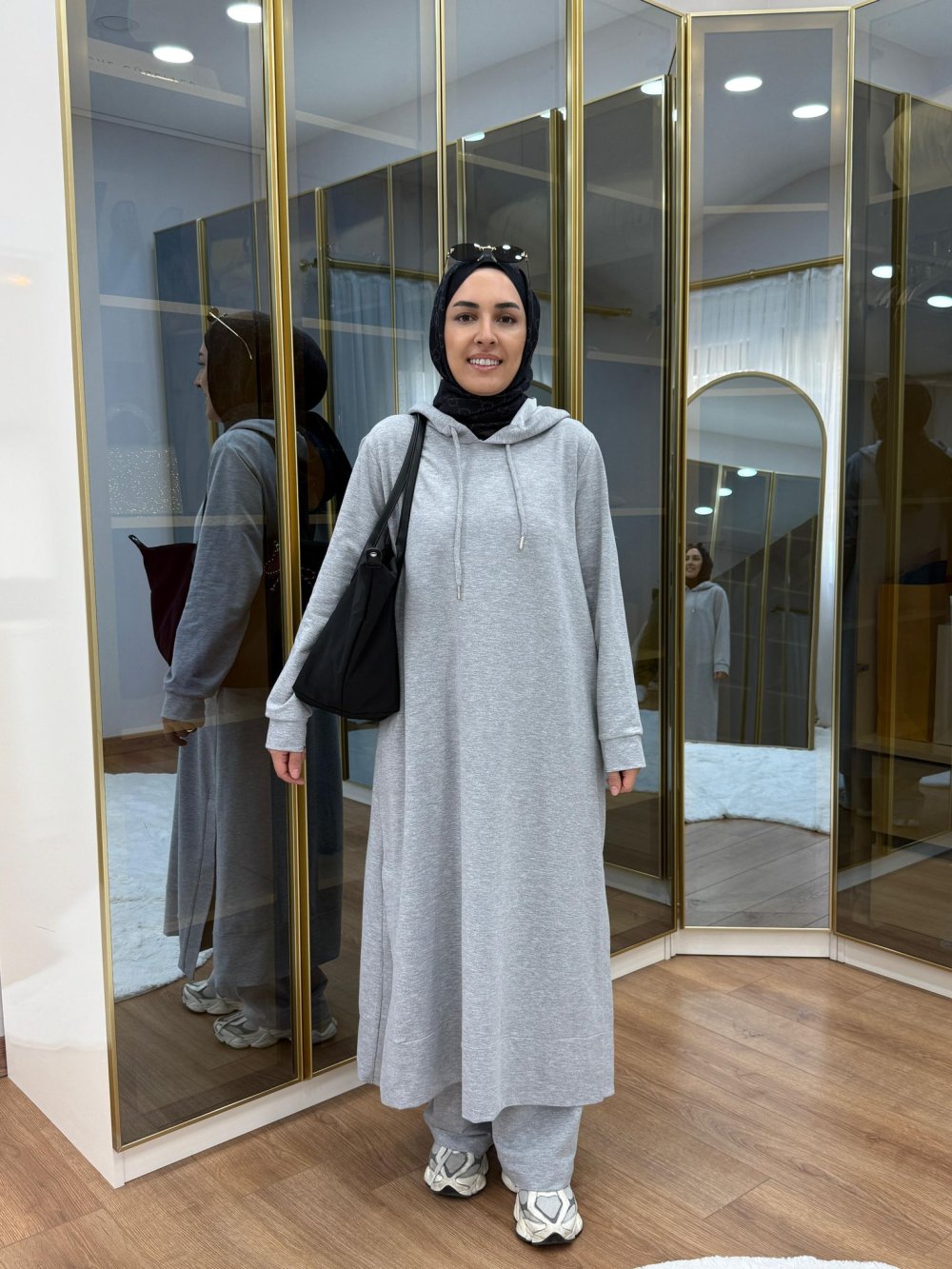 Kapüşonlu yırtmaçlı takım Gri Melanj