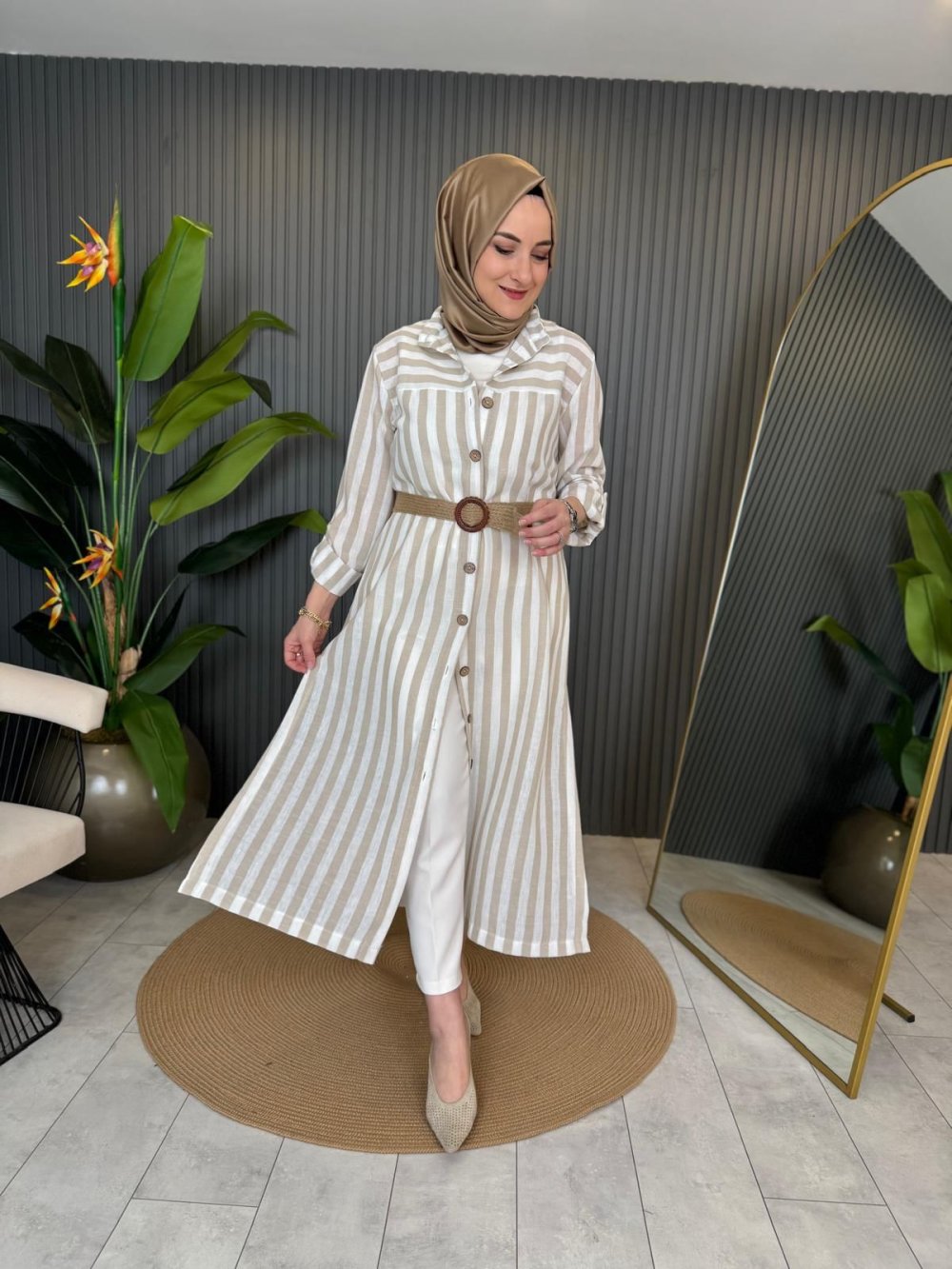 —Keten kumaştır. Hasır kemeri mevcuttur.