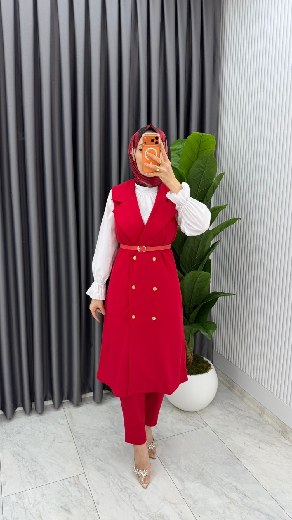 Kırmızı Tuğba Kemerli Yelek Takım Tesettür Giyim
