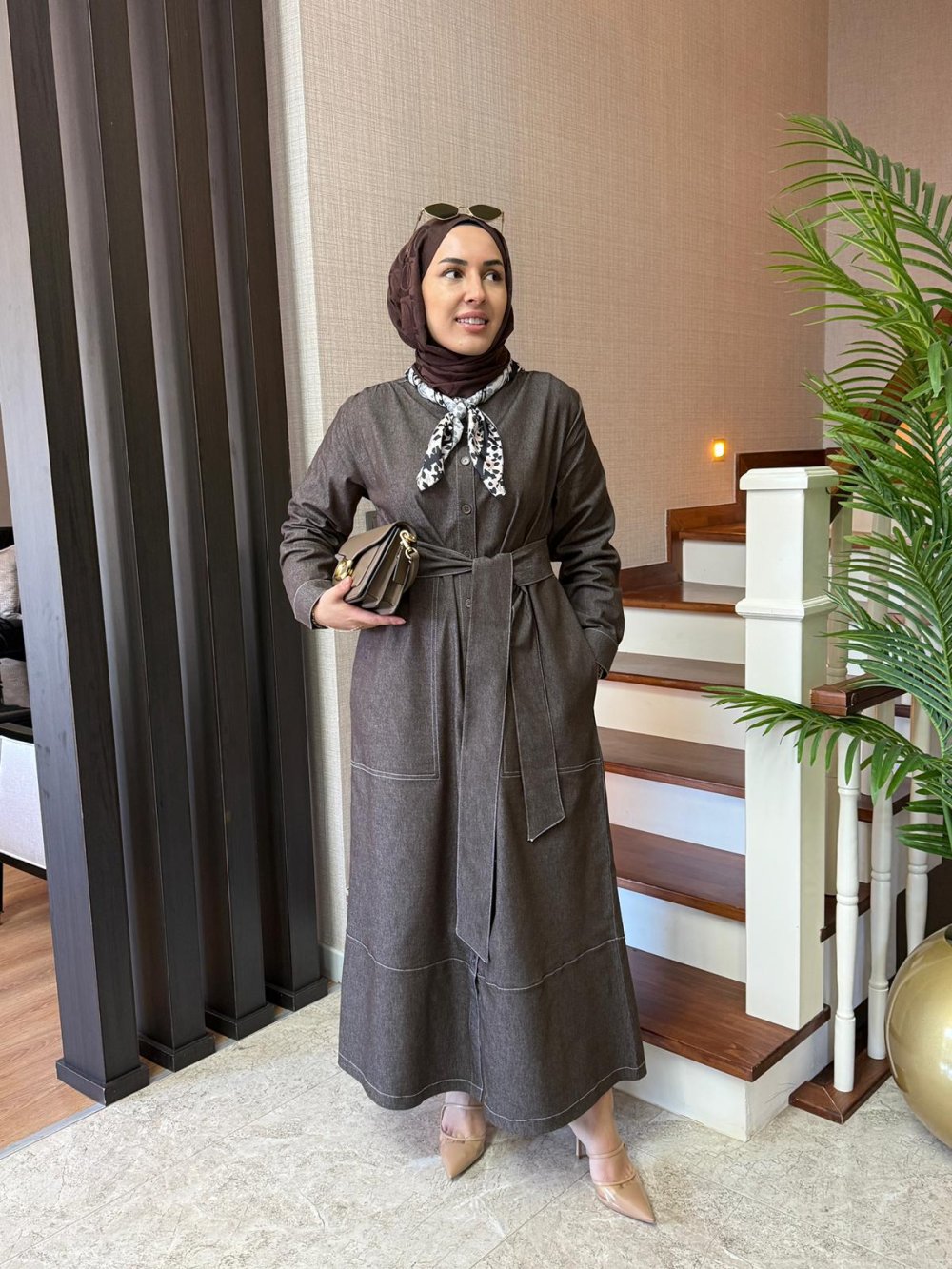 Kontrast Dikişli Kot Elbise Kahverengi