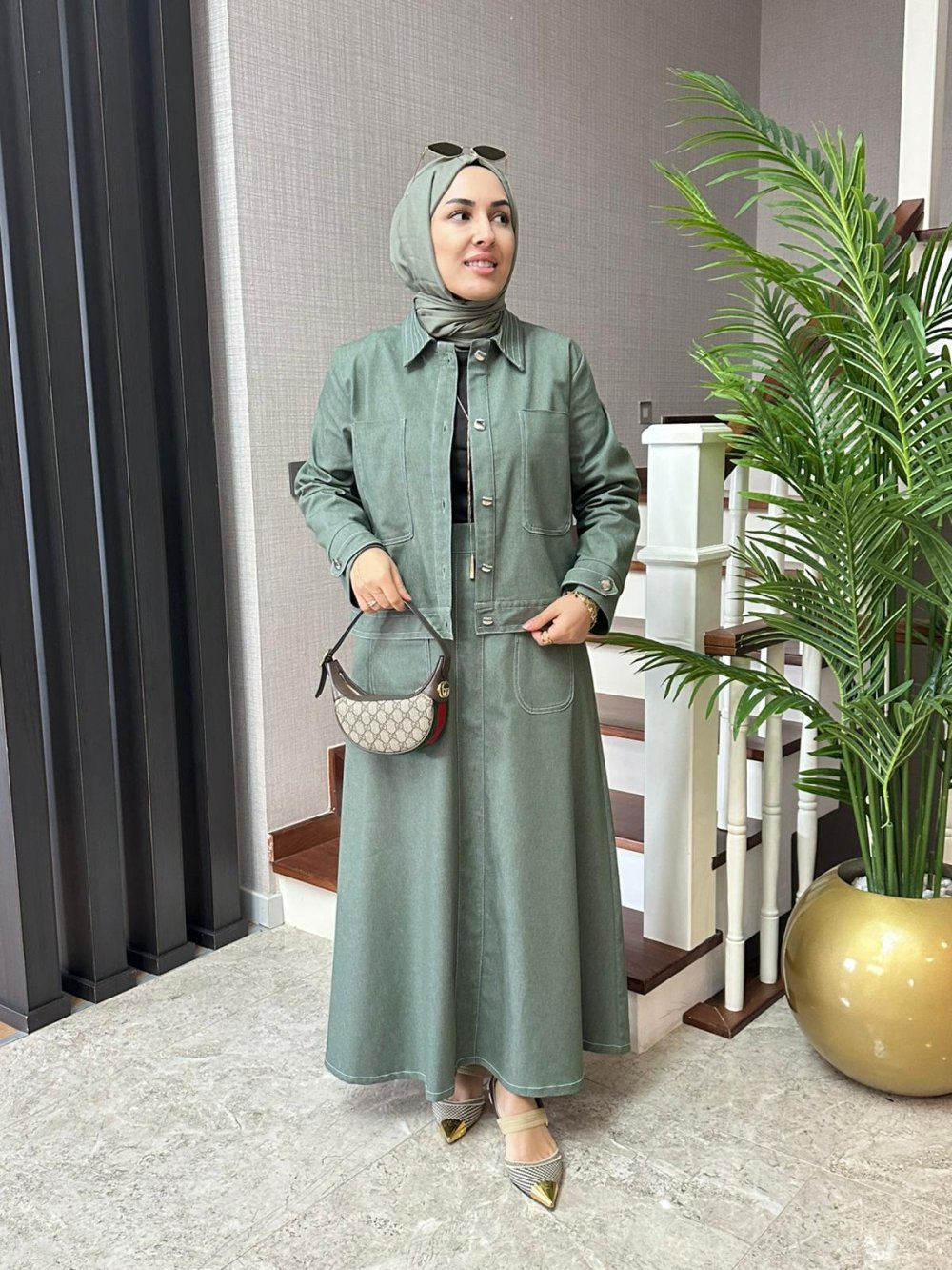 Kontrast Dikişli Kot Etekli Takım Haki