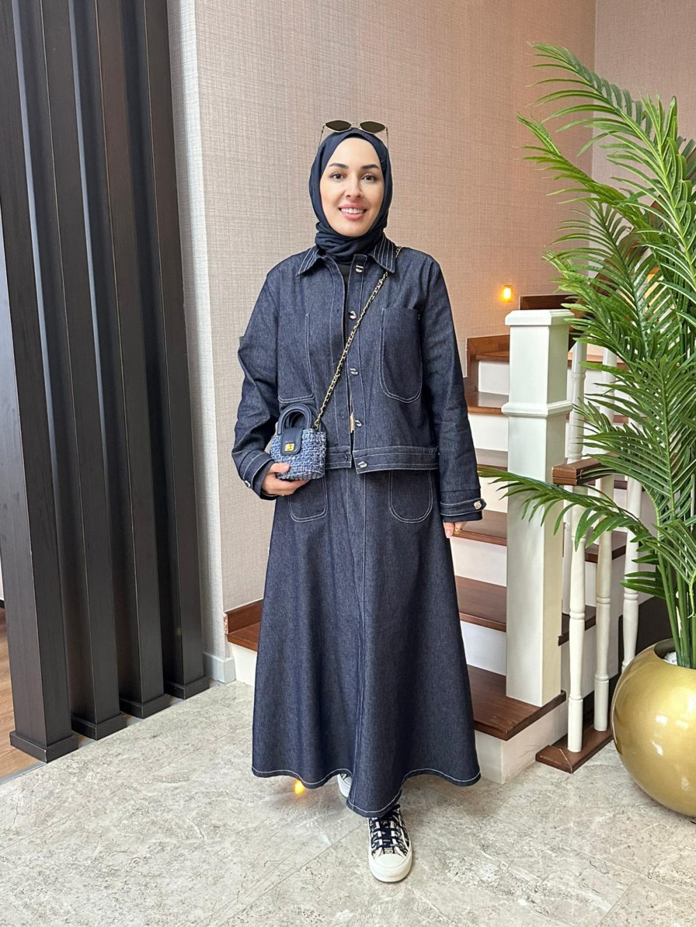 Kontrast Dikişli Kot Etekli Takım Lacivert