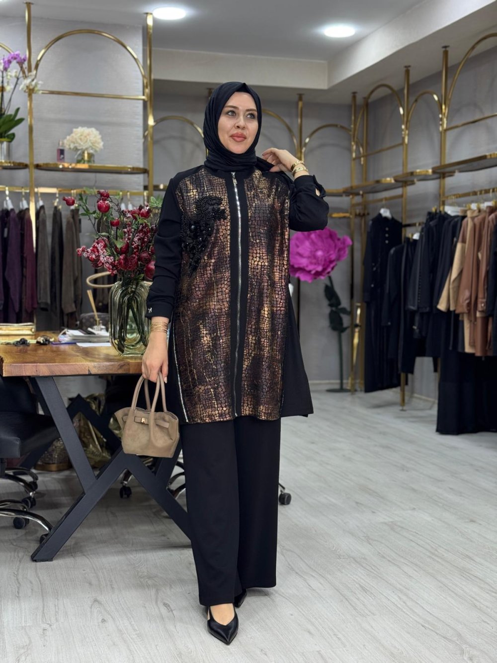 Kumaşı varaklı örme kumaştır. Taşı dikmedir. Önü fermuarlıdır.