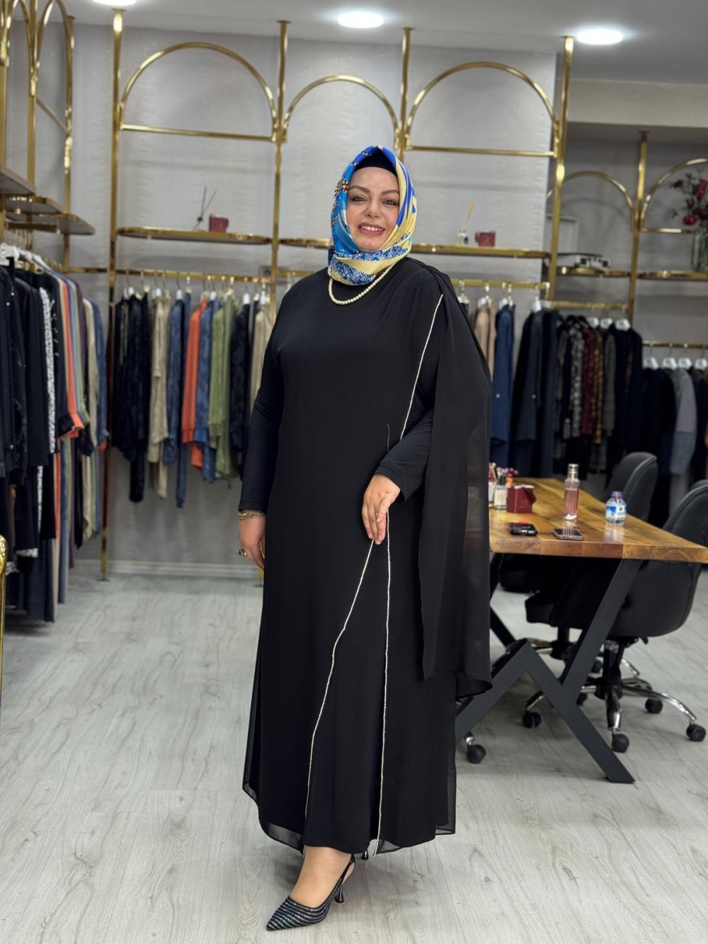 Kumaşı içi sandy dışı şifondur. Birleşiktir.