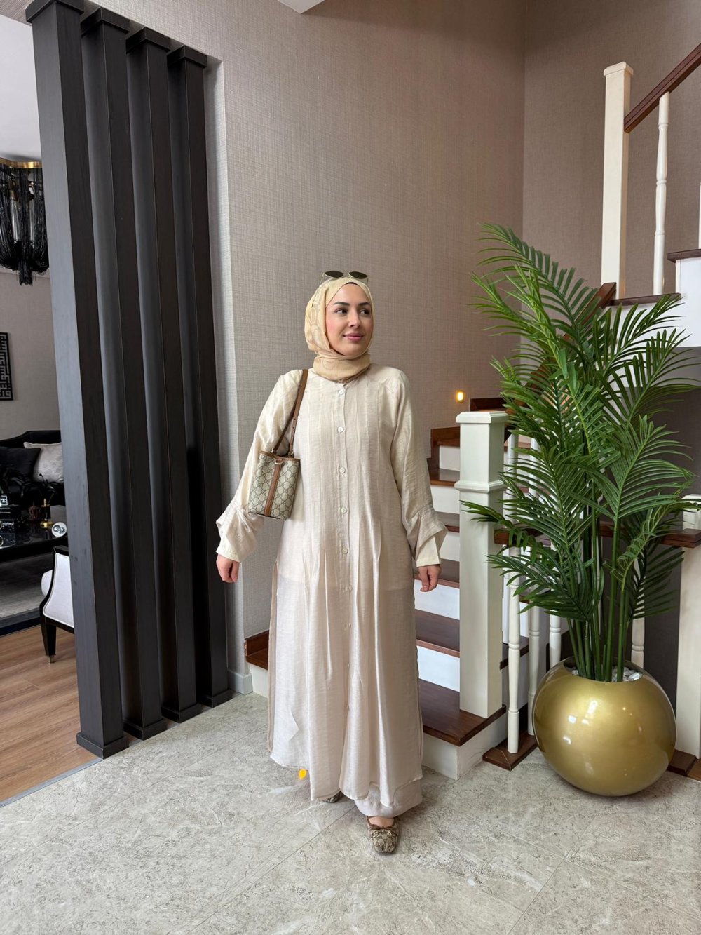 Tunik boy 125 cm’dir. Önü nervürlüdür, sedef düğme detaylıdır.