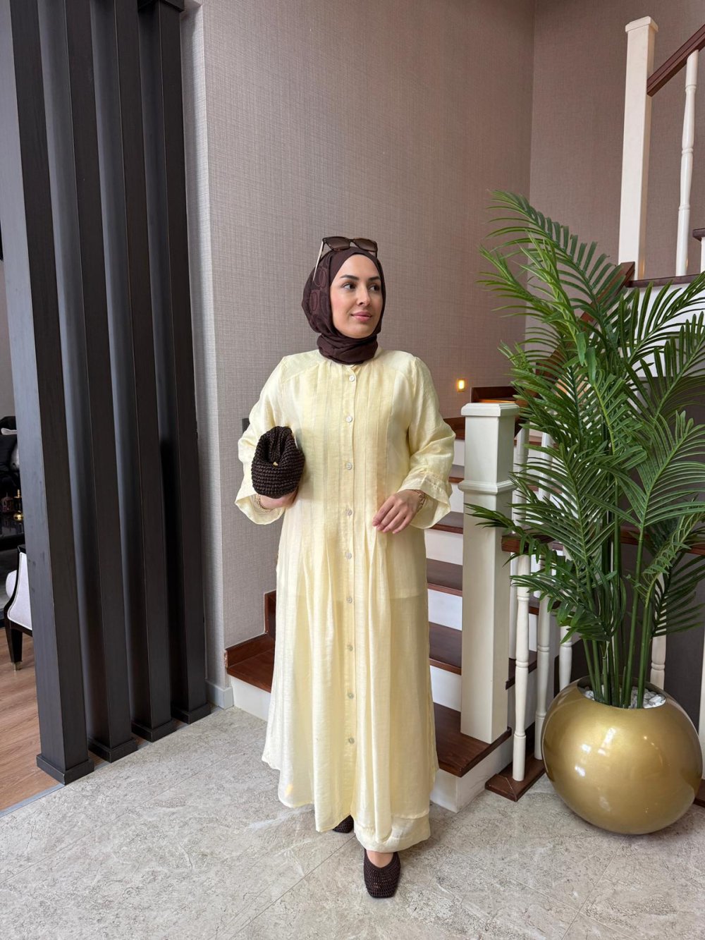 Tunik boy 125 cm’dir. Önü nervürlüdür, sedef düğme detaylıdır.