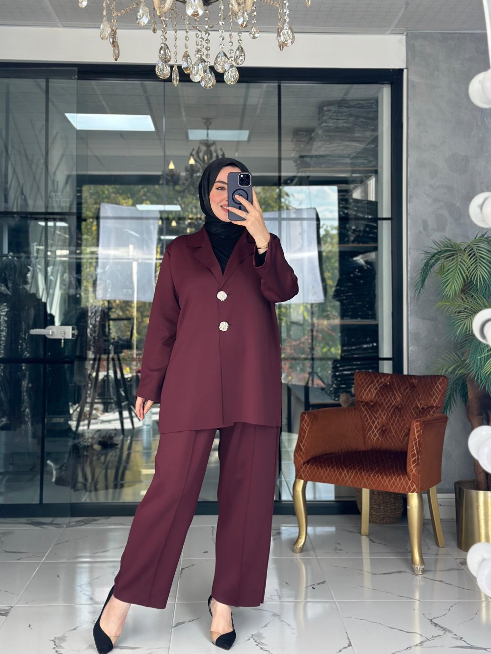 Kumaşı scuba kreptir. Önü düğmelidir. Pantolon beli lastiklidir. Rahat kalıptır.