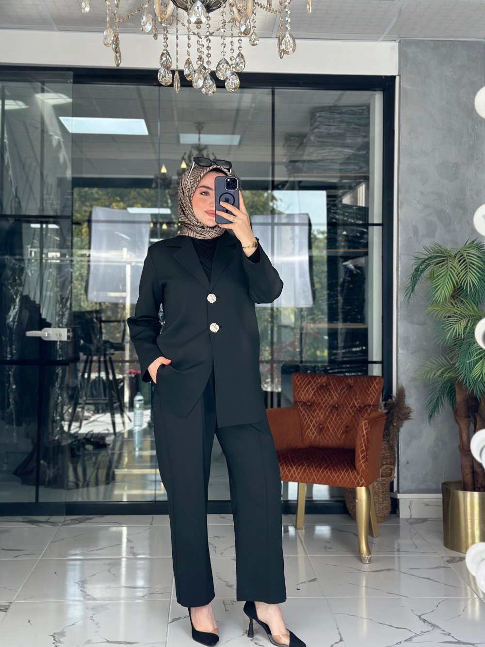 Kumaşı scuba kreptir. Önü düğmelidir. Pantolon beli lastiklidir. Rahat kalıptır.