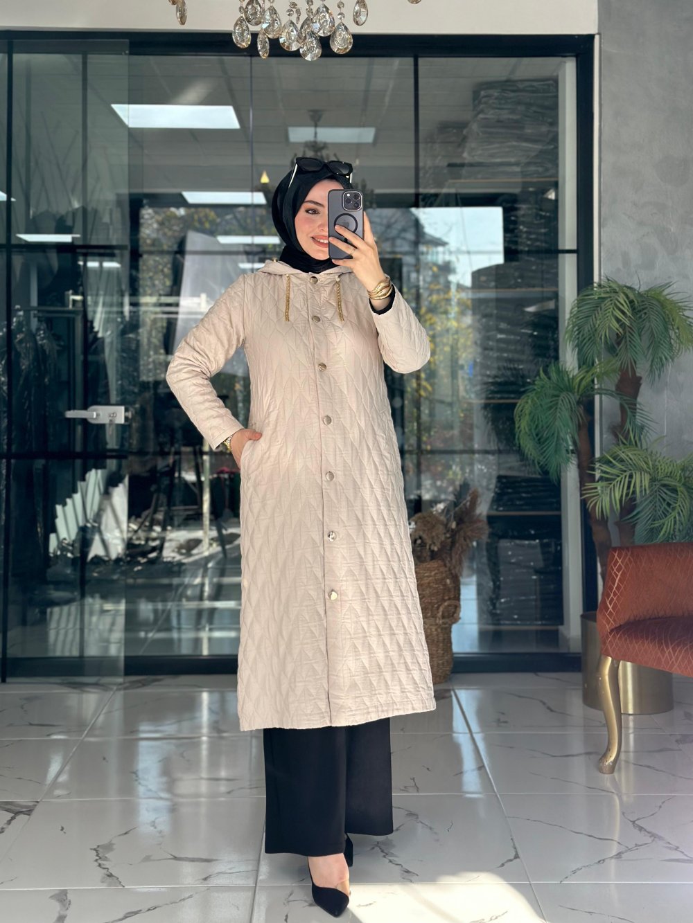 Kumaşı kapitonedir. Cepleri mevcuttur. Önü düğmelidir. Kapüşonu çıkmaz.