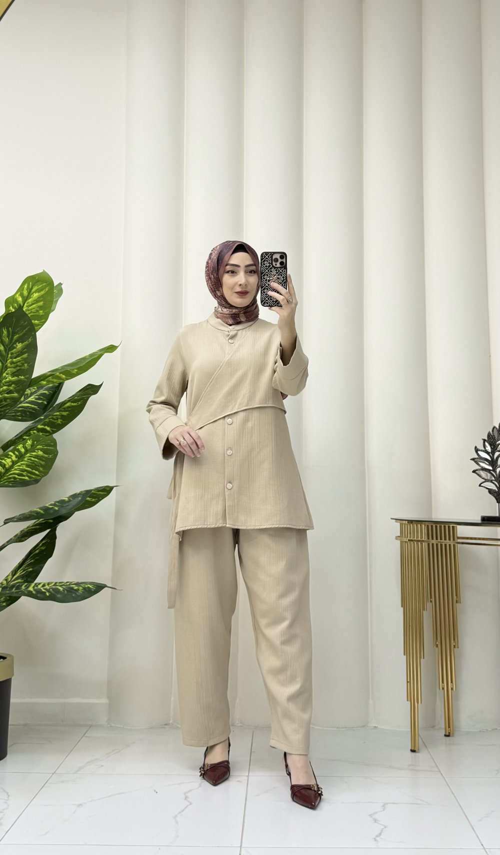 Minimal düğme detaylarıyla sade ama güçlü bir stil yaratır.