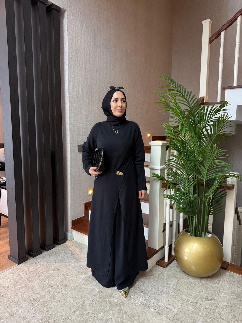 Pantolon boy 105 cm’dir. Önü kemerli, arkası lastiklidir. Pile detaylıdır. Palazzo pantolon formundadır.