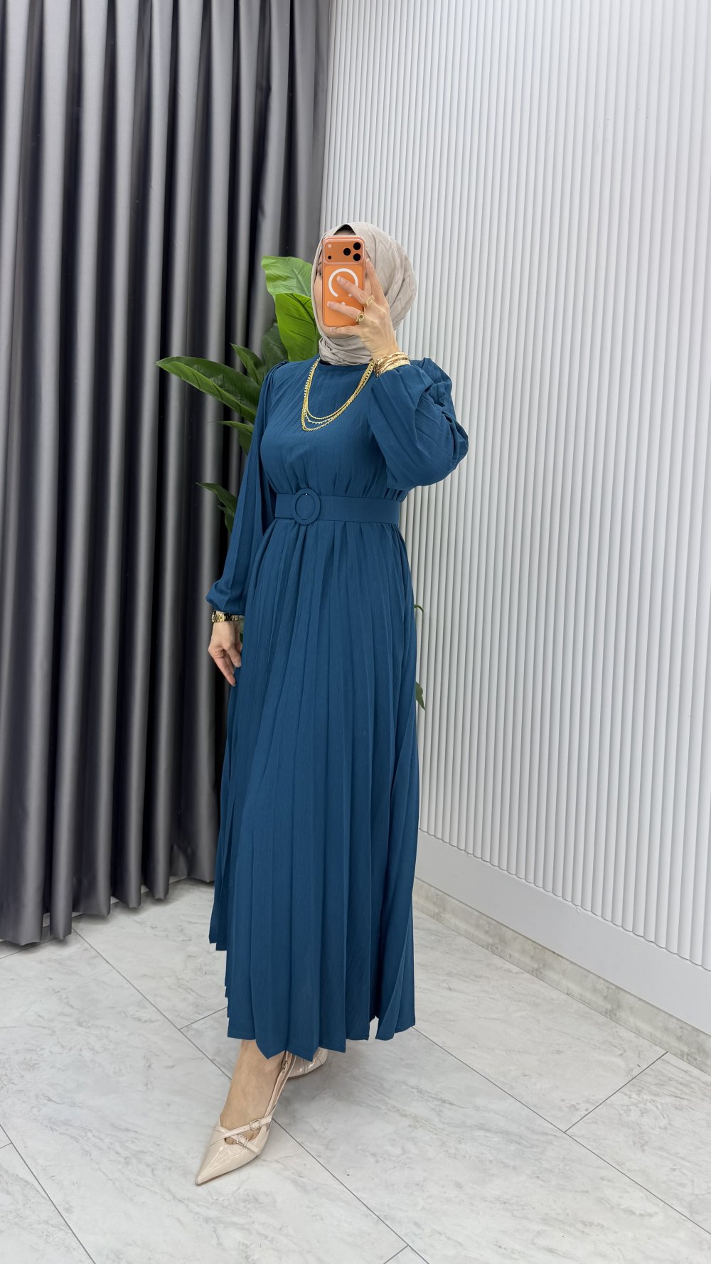 Petrol Hifa Piliseli Elbise Tesettür Giyim