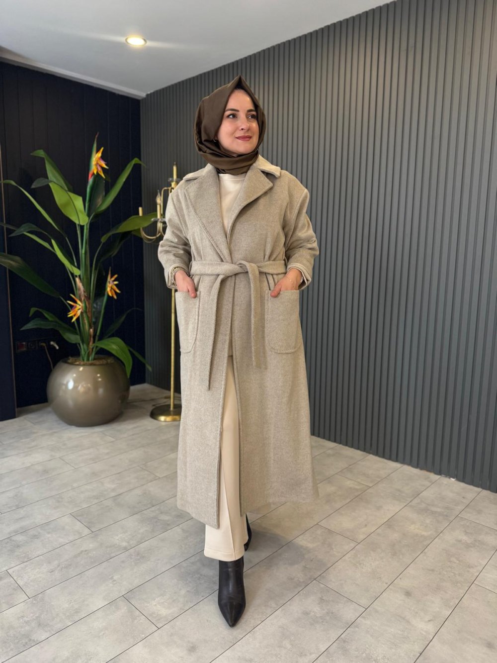 — Kaşe kumaştır. Kemerlidir. Astarsızdır.