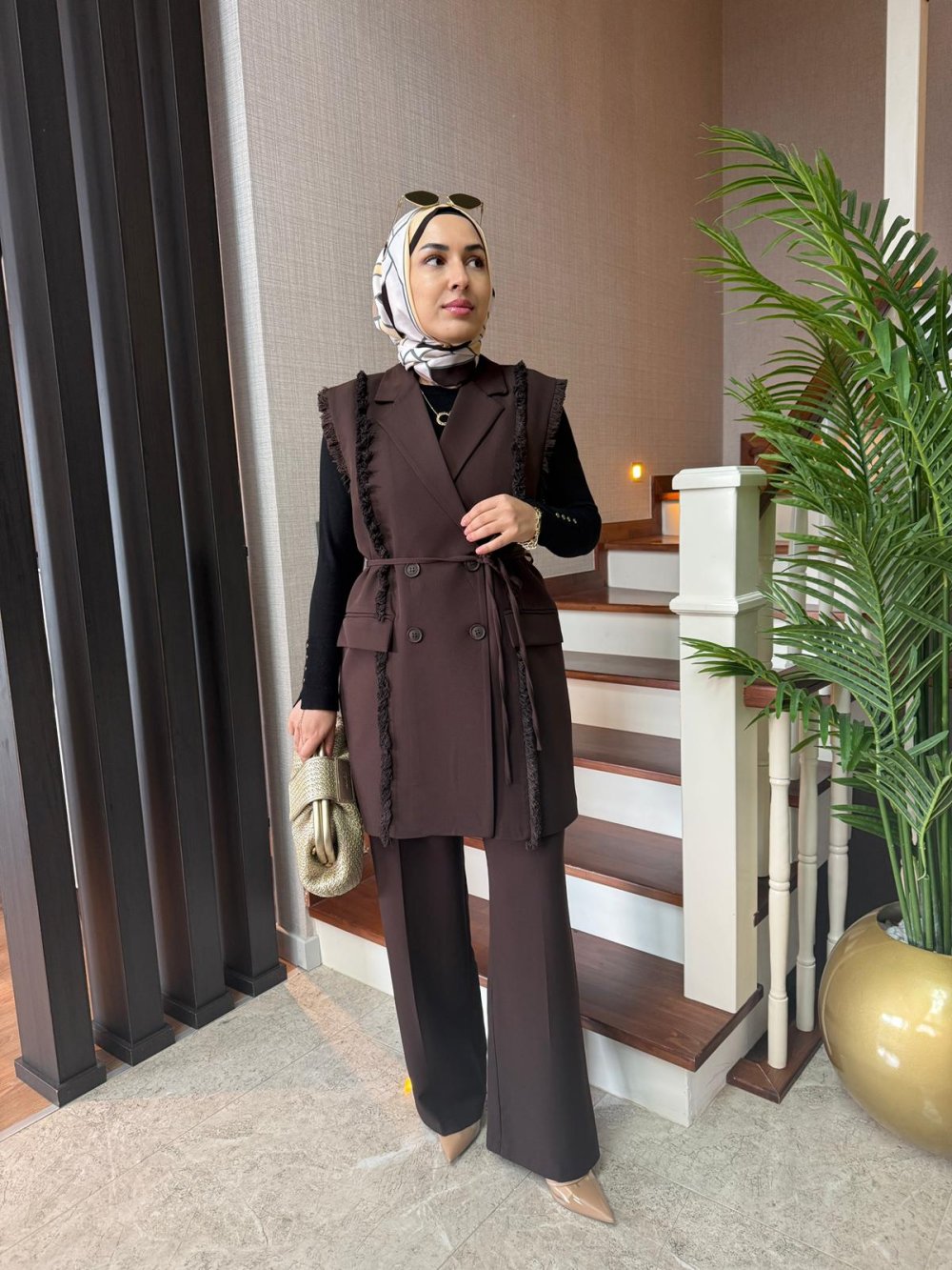 Püskül Detay Yelek Takım Kahverengi
