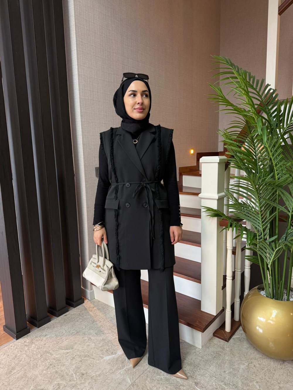 Yelek komple astarlıdır, püskül detaylıdır, boy uzunluğu 85 cm’dir.