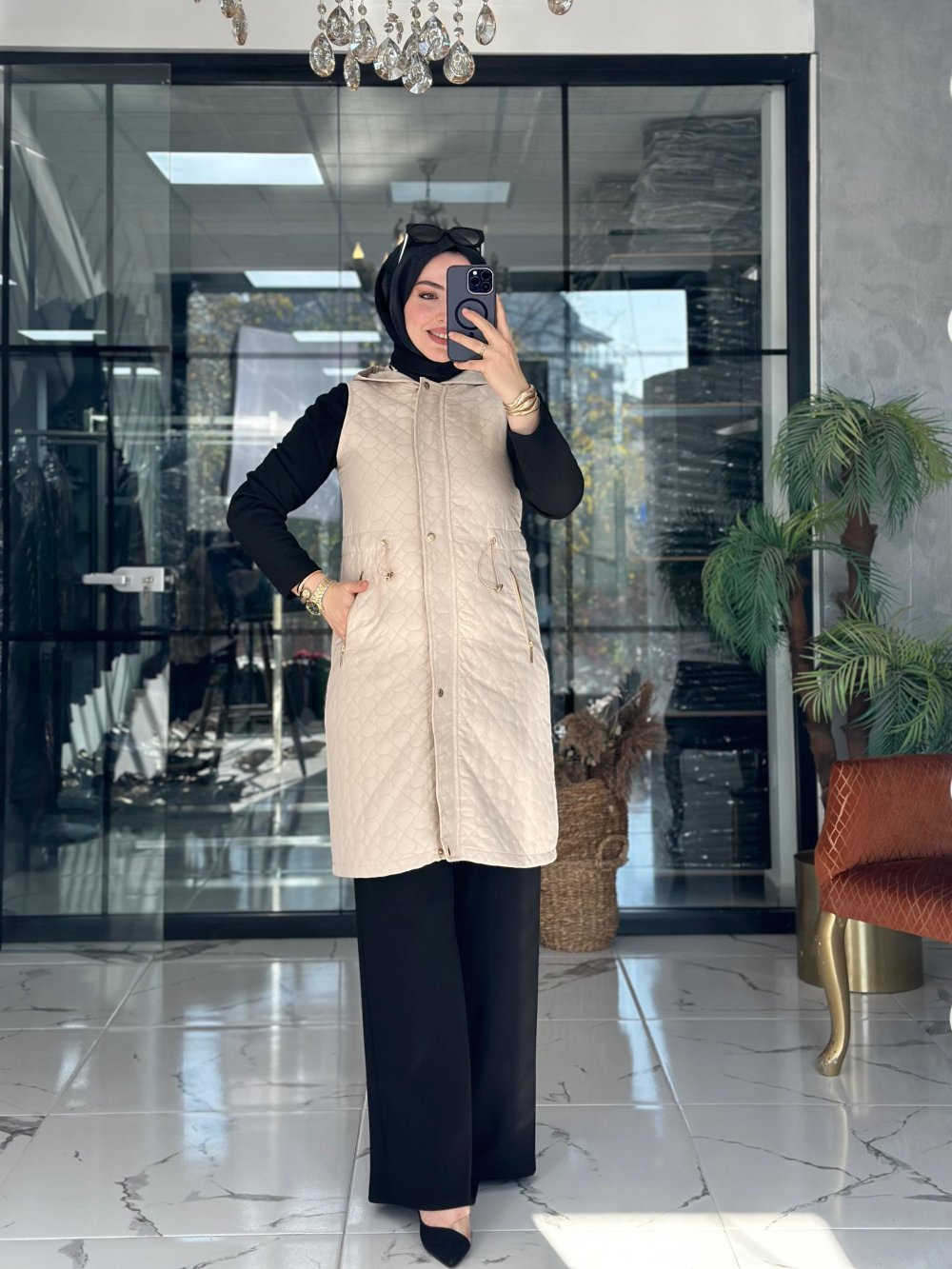 Kumaşı kapitonedir. Önü gizli fermuarlıdır. Kapak çıtçıtlıdır. Cepleri mevcuttur.