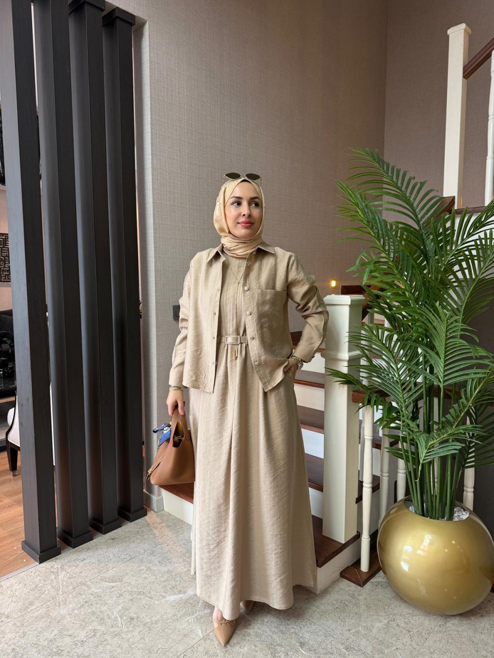 Elbise boy 138 cm’dir, sıfır kollu, arkadan fermuarlı, önünde nervür detayları bulunmaktadır ve kendinden kaplama kemeri mevcuttur.